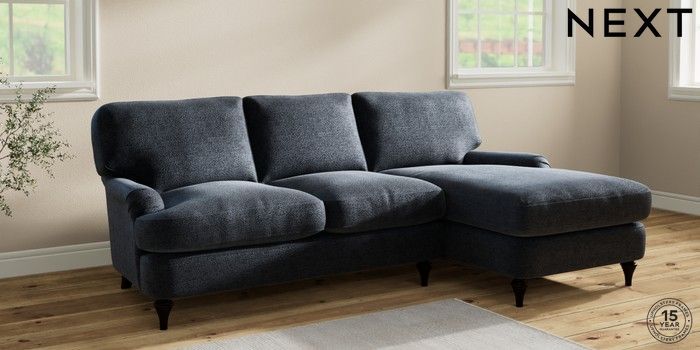 6.12.1 Buy Sadie Deep Relaxed Sit Medium Sofa Chaise - Right Hand Boucle Chenille Dark Slate Blue High Slim Turned - Dark from the Next UK online shop Click here to use our accessible website