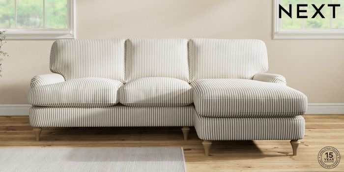 7.0.3 Buy Sadie Deep Relaxed Sit Medium Sofa Chaise - Right Hand Chenille Stripe Moss Green High Slim Turned - Light from the Next UK online shop Click here to use our accessible website