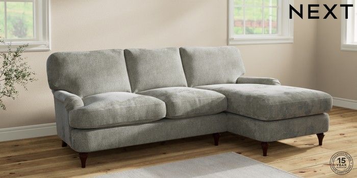 6.12.1 Buy Sadie Deep Relaxed Sit Medium Sofa Chaise - Right Hand Chunky Chenille Light Grey High Slim Turned - Dark Brown from the Next UK online shop Click here to use our accessible website