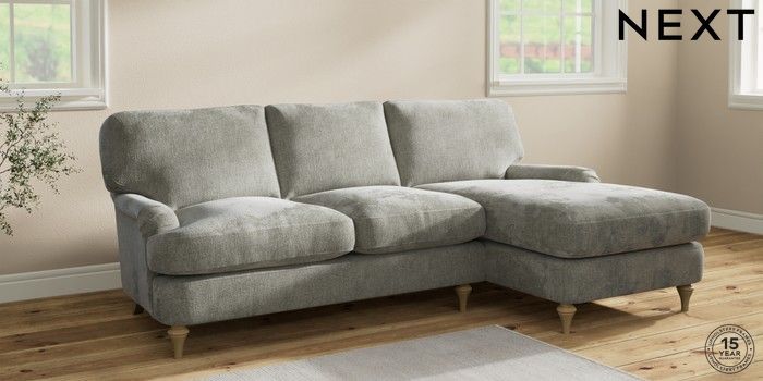 6.12.1 Buy Sadie Deep Relaxed Sit Medium Sofa Chaise - Right Hand Chunky Chenille Light Grey High Slim Turned - Light from the Next UK online shop Click here to use our accessible website