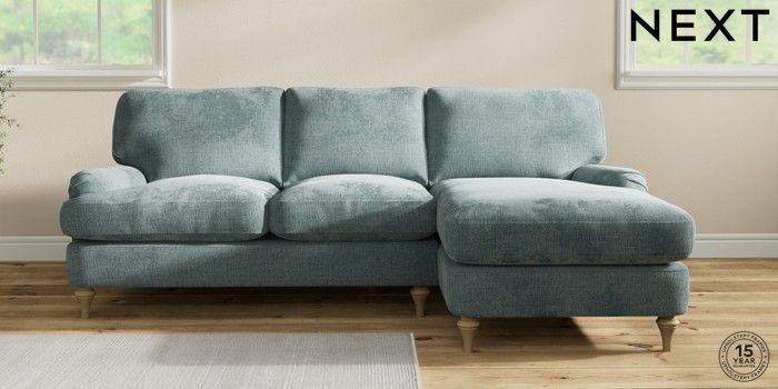 7.0.3 Buy Sadie Deep Relaxed Sit Medium Sofa Chaise - Right Hand Chunky Chenille Light Teal Green High Slim Turned - Light from the Next UK online shop Click here to use our accessible website