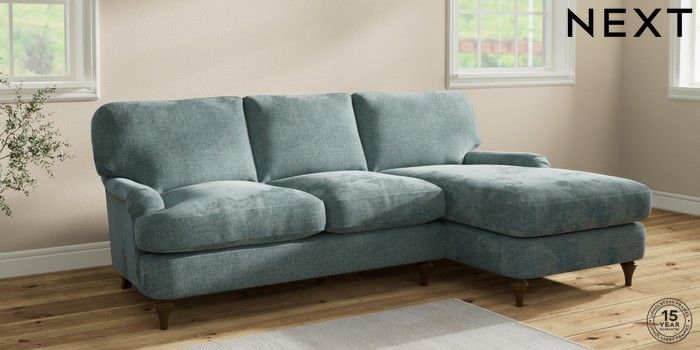 6.12.1 Buy Sadie Deep Relaxed Sit Medium Sofa Chaise - Right Hand Chunky Chenille Light Teal Green High Slim Turned - Mid from the Next UK online shop Click here to use our accessible website