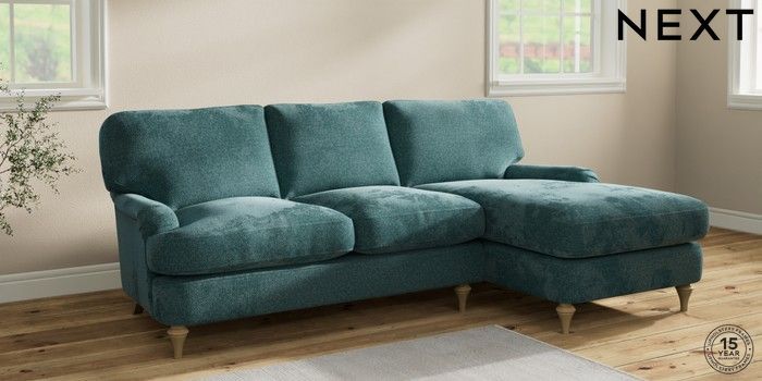 6.12.1 Buy Sadie Deep Relaxed Sit Medium Sofa Chaise - Right Hand Chunky Chenille Mid Teal Green High Slim Turned - Light from the Next UK online shop Click here to use our accessible website