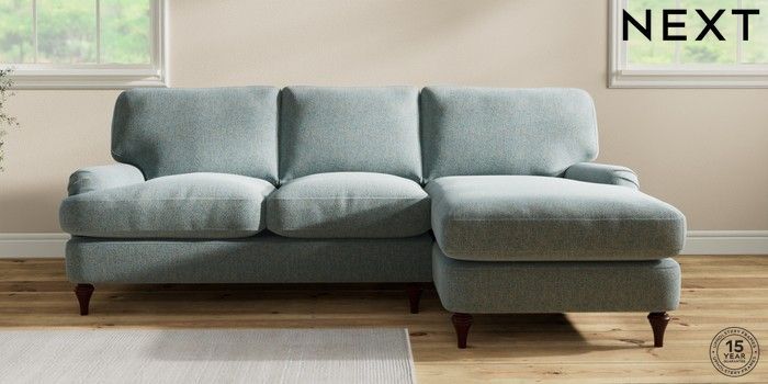 7.0.3 Buy Sadie Deep Relaxed Sit Medium Sofa Chaise - Right Hand Chunky Marl Mid Blue High Slim Turned - Dark Brown from the Next UK online shop Click here to use our accessible website