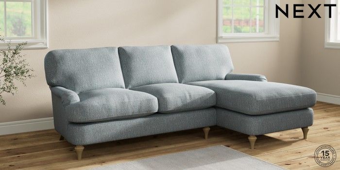 6.12.1 Buy Sadie Deep Relaxed Sit Medium Sofa Chaise - Right Hand Chunky Weave Mid Blue High Slim Turned - Light from the Next UK online shop Click here to use our accessible website