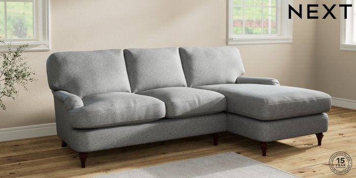 6.12.1 Buy Sadie Deep Relaxed Sit Medium Sofa Chaise - Right Hand Chunky Weave Mid Grey High Slim Turned - Dark Brown from the Next UK online shop Click here to use our accessible website