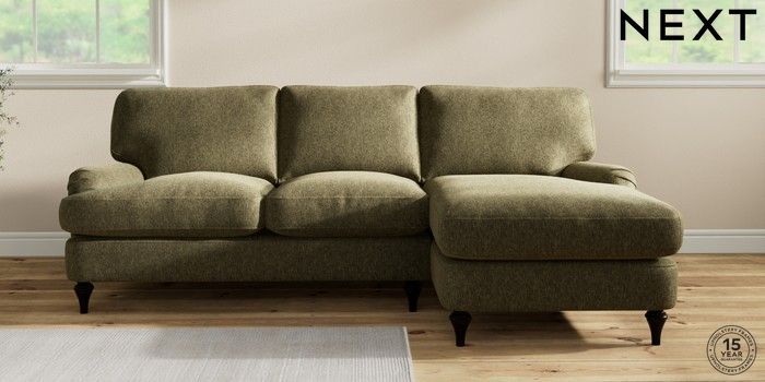 7.0.3 Buy Sadie Deep Relaxed Sit Medium Sofa Chaise - Right Hand Cotswold Chenille Dark Green High Slim Turned - Dark from the Next UK online shop Click here to use our accessible website
