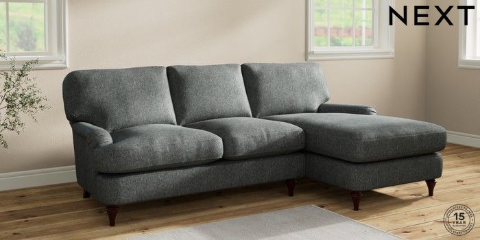 6.12.1 Buy Sadie Deep Relaxed Sit Medium Sofa Chaise - Right Hand Cotswold Chenille Dark Grey High Slim Turned - Dark Brown from the Next UK online shop Click here to use our accessible website
