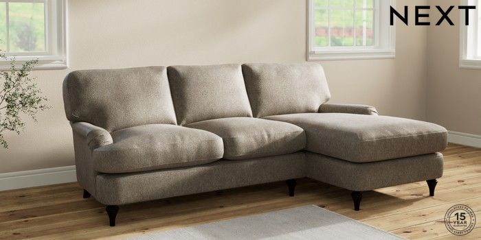 6.12.1 Buy Sadie Deep Relaxed Sit Medium Sofa Chaise - Right Hand Cotswold Chenille Mid Mink Brown High Slim Turned - Dark from the Next UK online shop Click here to use our accessible website
