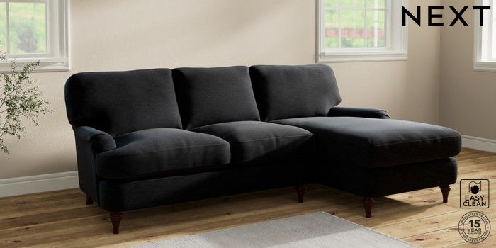 6.12.1 Buy Sadie Deep Relaxed Sit Medium Sofa Chaise - Right Hand Fine Chenille Easy Clean Black High Slim Turned - Dark Brown from the Next UK online shop Click here to use our accessible website