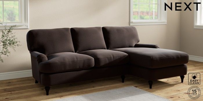 6.12.1 Buy Sadie Deep Relaxed Sit Medium Sofa Chaise - Right Hand Fine Chenille Easy Clean Chocolate Brown High Slim Turned - Dark from the Next UK online shop Click here to use our accessible website