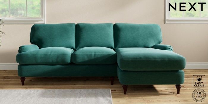 7.0.3 Buy Sadie Deep Relaxed Sit Medium Sofa Chaise - Right Hand Fine Chenille Easy Clean Dark Juniper Green High Slim Turned - Dark Brown from the Next UK online shop Click here to use our accessible website