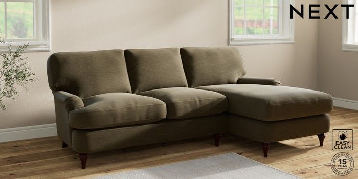 6.12.1 Buy Sadie Deep Relaxed Sit Medium Sofa Chaise - Right Hand Fine Chenille Easy Clean Dark Moss Green High Slim Turned - Dark Brown from the Next UK online shop Click here to use our accessible website