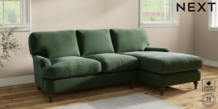 6.12.1 Buy Sadie Deep Relaxed Sit Medium Sofa Chaise - Right Hand Fine Chenille Easy Clean Mid Khaki Green High Slim Turned - Mid from the Next UK online shop Click here to use our accessible website