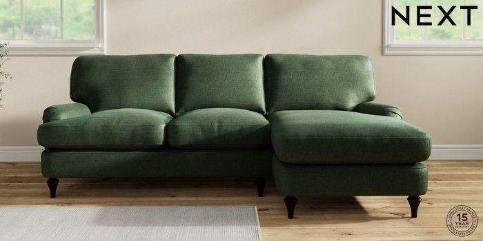 7.0.3 Buy Sadie Deep Relaxed Sit Medium Sofa Chaise - Right Hand Luxe Chenille Dark Green High Slim Turned - Dark from the Next UK online shop Click here to use our accessible website