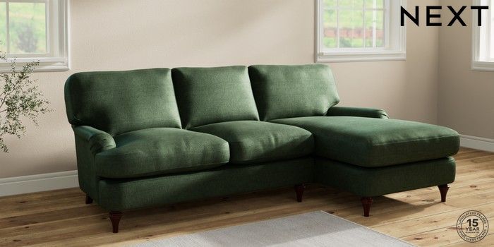 6.12.1 Buy Sadie Deep Relaxed Sit Medium Sofa Chaise - Right Hand Luxe Chenille Dark Green High Slim Turned - Dark Brown from the Next UK online shop Click here to use our accessible website