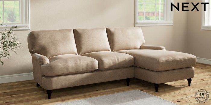 6.12.1 Buy Sadie Deep Relaxed Sit Medium Sofa Chaise - Right Hand Luxe Chenille Mid Camel Beige High Slim Turned - Dark from the Next UK online shop Click here to use our accessible website