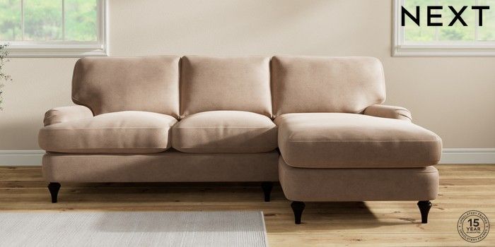 7.0.3 Buy Sadie Deep Relaxed Sit Medium Sofa Chaise - Right Hand Luxe Chenille Mid Natural High Slim Turned - Dark from the Next UK online shop Click here to use our accessible website