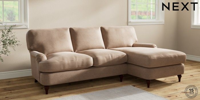6.12.1 Buy Sadie Deep Relaxed Sit Medium Sofa Chaise - Right Hand Luxe Chenille Mid Natural High Slim Turned - Dark Brown from the Next UK online shop Click here to use our accessible website