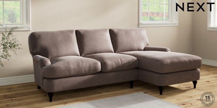 6.12.1 Buy Sadie Deep Relaxed Sit Medium Sofa Chaise - Right Hand Luxe Chenille Mink Brown High Slim Turned - Dark from the Next UK online shop Click here to use our accessible website