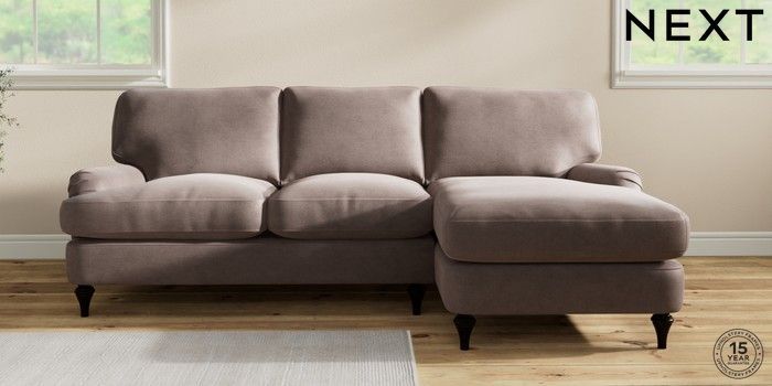 7.0.3 Buy Sadie Deep Relaxed Sit Medium Sofa Chaise - Right Hand Luxe Chenille Mink Brown High Slim Turned - Dark from the Next UK online shop Click here to use our accessible website