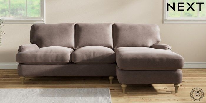 7.0.3 Buy Sadie Deep Relaxed Sit Medium Sofa Chaise - Right Hand Luxe Chenille Mink Brown High Slim Turned - Light from the Next UK online shop Click here to use our accessible website