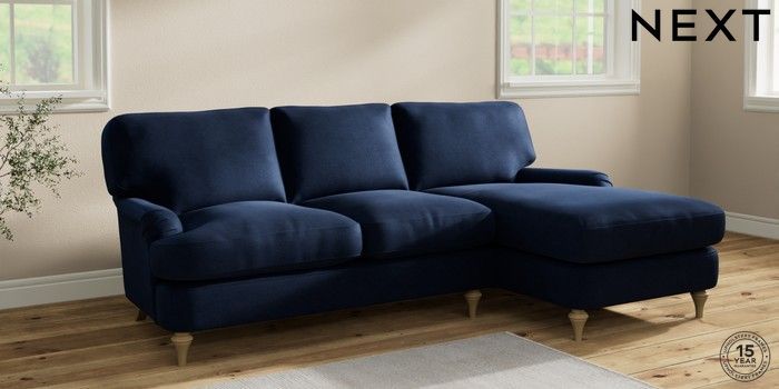 6.12.1 Buy Sadie Deep Relaxed Sit Medium Sofa Chaise - Right Hand Luxe Chenille Navy Blue High Slim Turned - Light from the Next UK online shop Click here to use our accessible website