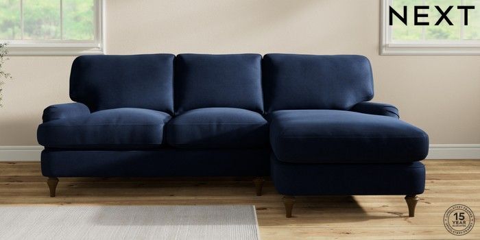 7.0.3 Buy Sadie Deep Relaxed Sit Medium Sofa Chaise - Right Hand Luxe Chenille Navy Blue High Slim Turned - Mid from the Next UK online shop Click here to use our accessible website