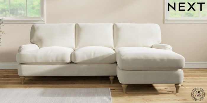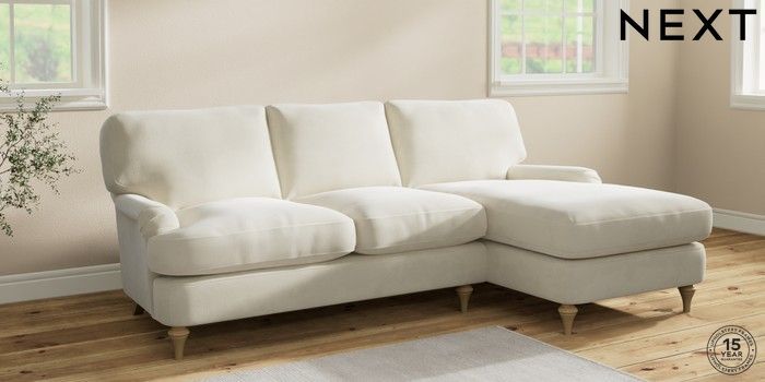 7.0.3 Buy Sadie Deep Relaxed Sit Medium Sofa Chaise - Right Hand Luxe Chenille Oyster High Slim Turned - Light from the Next UK online shop Click here to use our accessible website