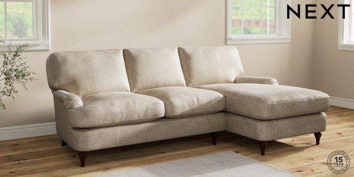 6.12.1 Buy Sadie Deep Relaxed Sit Medium Sofa Chaise - Right Hand Plush Chenille Light Natural High Slim Turned - Dark Brown from the Next UK online shop Click here to use our accessible website
