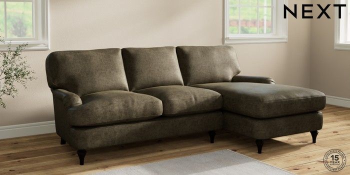 6.12.1 Buy Sadie Deep Relaxed Sit Medium Sofa Chaise - Right Hand Plush Chenille Moss Green High Slim Turned - Dark from the Next UK online shop Click here to use our accessible website