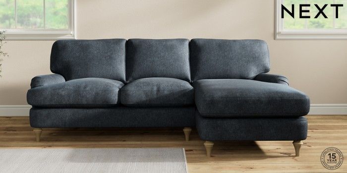 7.0.3 Buy Sadie Deep Relaxed Sit Medium Sofa Chaise - Right Hand Plush Chenille Slate Blue High Slim Turned - Light from the Next UK online shop Click here to use our accessible website