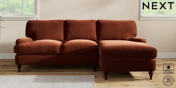 7.0.3 Buy Sadie Deep Relaxed Sit Medium Sofa Chaise - Right Hand Plush Velvet Easy Clean Ginger Orange High Slim Turned - Dark Brown from the Next UK online shop Click here to use our accessible website