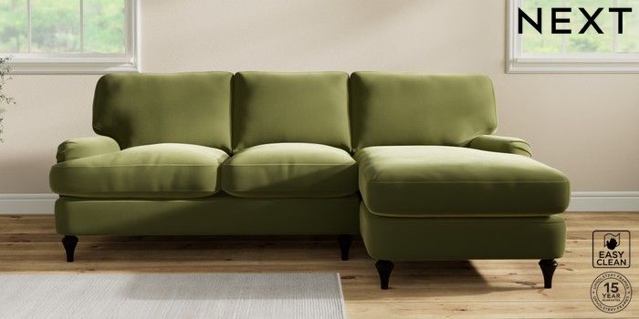 7.0.3 Buy Sadie Deep Relaxed Sit Medium Sofa Chaise - Right Hand Plush Velvet Easy Clean Mid Olive Green High Slim Turned - Dark from the Next UK online shop Click here to use our accessible website