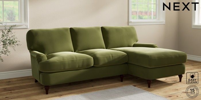 6.12.1 Buy Sadie Deep Relaxed Sit Medium Sofa Chaise - Right Hand Plush Velvet Easy Clean Mid Olive Green High Slim Turned - Dark Brown from the Next UK online shop Click here to use our accessible website