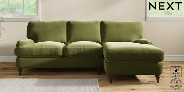 7.0.3 Buy Sadie Deep Relaxed Sit Medium Sofa Chaise - Right Hand Plush Velvet Easy Clean Mid Olive Green High Slim Turned - Mid from the Next UK online shop Click here to use our accessible website