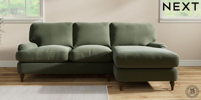 7.0.3 Buy Sadie Deep Relaxed Sit Medium Sofa Chaise - Right Hand Relaxed Linen Look Dark Green High Slim Turned - Mid from the Next UK online shop Click here to use our accessible website