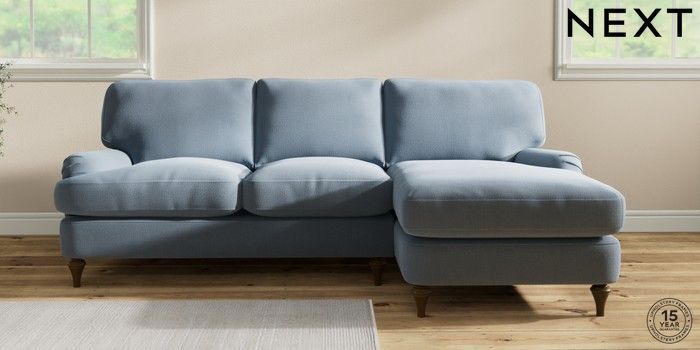 7.0.3 Buy Sadie Deep Relaxed Sit Medium Sofa Chaise - Right Hand Relaxed Linen Look Mid Blue High Slim Turned - Mid from the Next UK online shop Click here to use our accessible website