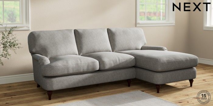 6.12.1 Buy Sadie Deep Relaxed Sit Medium Sofa Chaise - Right Hand Tweedy Chenille Mid Grey High Slim Turned - Dark Brown from the Next UK online shop Click here to use our accessible website