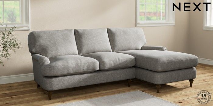 6.12.1 Buy Sadie Deep Relaxed Sit Medium Sofa Chaise - Right Hand Tweedy Chenille Mid Grey High Slim Turned - Mid from the Next UK online shop Click here to use our accessible website