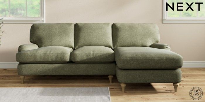 7.0.3 Buy Sadie Deep Relaxed Sit Medium Sofa Chaise - Right Hand Tweedy Chenille Mid Moss Green High Slim Turned - Light from the Next UK online shop Click here to use our accessible website