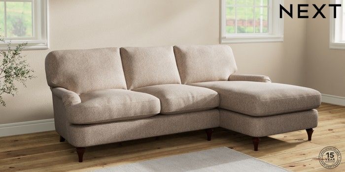 6.12.1 Buy Sadie Deep Relaxed Sit Medium Sofa Chaise - Right Hand Tweedy Chenille Mid Natural High Slim Turned - Dark Brown from the Next UK online shop Click here to use our accessible website