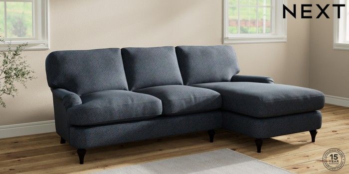 6.12.1 Buy Sadie Deep Relaxed Sit Medium Sofa Chaise - Right Hand Tweedy Chenille Navy Blue High Slim Turned - Dark from the Next UK online shop Click here to use our accessible website