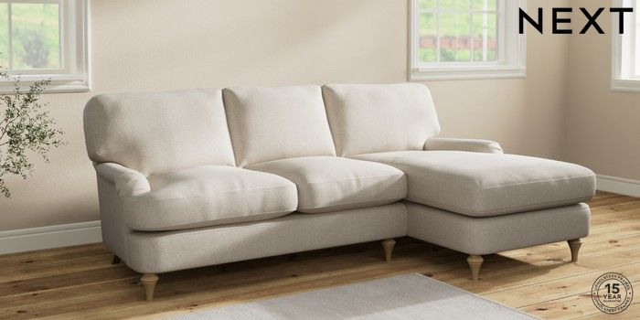 6.12.1 Buy Sadie Deep Relaxed Sit Medium Sofa Chaise - Right Hand Tweedy Chenille Oyster High Slim Turned - Light from the Next UK online shop Click here to use our accessible website