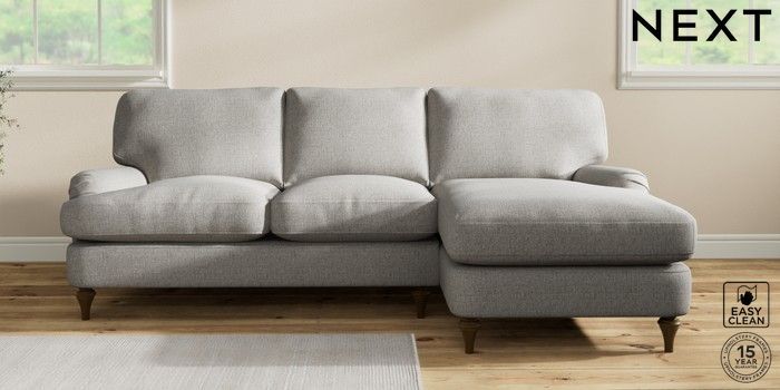 7.0.3 Buy Sadie Deep Relaxed Sit Medium Sofa Chaise - Right Hand Woven Chenille Easy Clean Light Grey High Slim Turned - Mid from the Next UK online shop Click here to use our accessible website