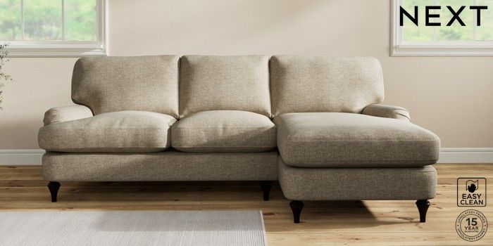 7.0.3 Buy Sadie Deep Relaxed Sit Medium Sofa Chaise - Right Hand Woven Chenille Easy Clean Mid Natural High Slim Turned - Dark from the Next UK online shop Click here to use our accessible website