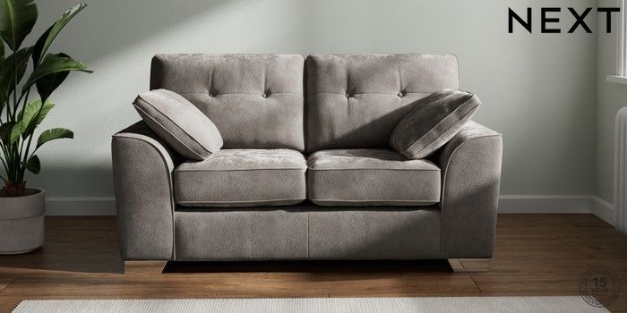 7.2.10 Buy Stamford Buttoned Back 2 Seater Small Sofa Distressed Velour French Grey Large Square Angle - Chrome Metal from the Next UK online shop Click here to use our accessible website