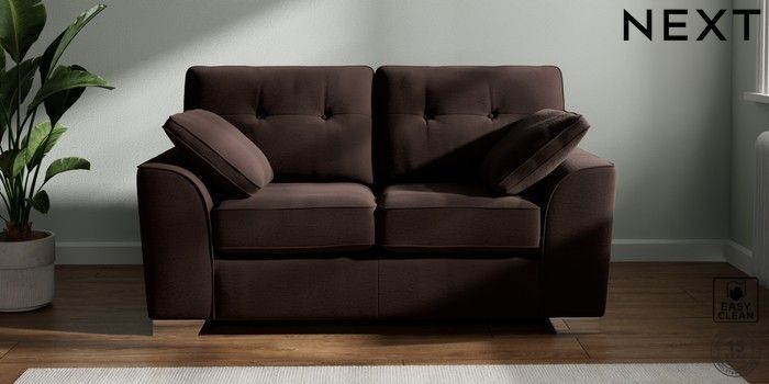7.2.10 Buy Stamford Buttoned Back 2 Seater Small Sofa Fine Chenille Easy Clean Chocolate Brown Large Square Angle - Chrome Metal from the Next UK online shop Click here to use our accessible website