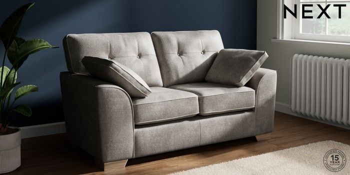 7.2.10 Buy Stamford Buttoned Back 2 Seater Small Sofa Plush Chenille Light Grey Large Square Angle - Chrome Metal from the Next UK online shop Click here to use our accessible website