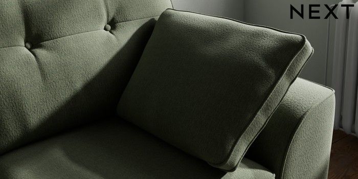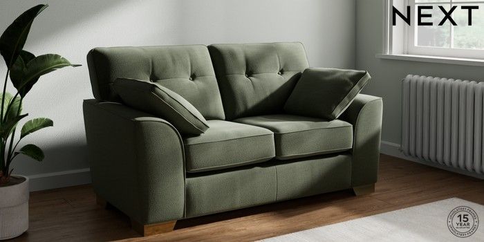 7.2.10 Buy Stamford Buttoned Back 2 Seater Small Sofa Relaxed Linen Look Dark Green Large Square Angle - Brushed Brass from the Next UK online shop Click here to use our accessible website